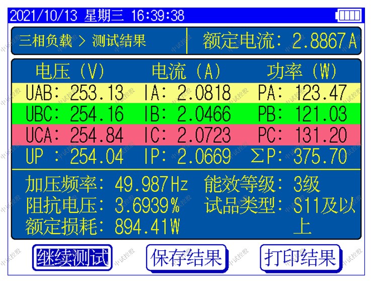 显示三相电压、三相电流、三相功率,自动计算出变压器的阻抗电压百分比,折算到额定温度、额定电流下的负载损耗,自动判断出油浸式或干式配电变压器的铁芯型号,测试过程中具有报警自适应提示功能,方便现场用户使用。