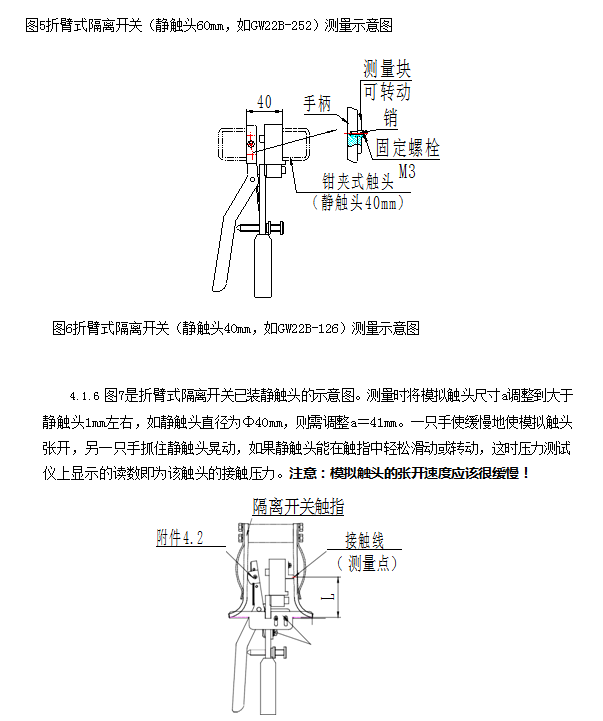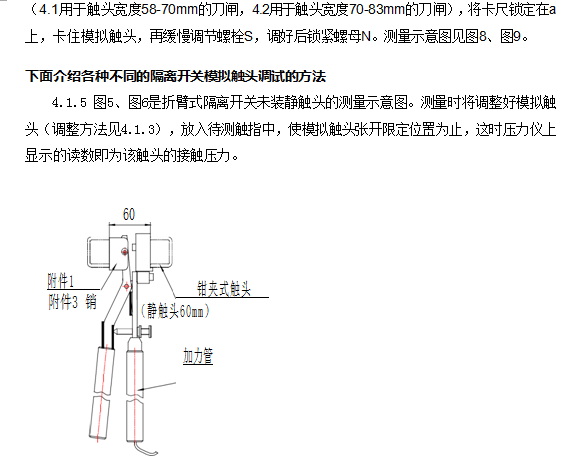 在各类检修导程(规程)、标准中都有测量触指接触压力的规定,推荐的测量工具为弹簧秤,在实际工作中,测量触指压力要在高空,用弹簧秤测压力不但不方便、不准确也不安全,有些结构的隔离开关的触指压力用弹簧秤根本无法测量(如剪刀式)。所以,要求测量触指接触压力只是一纸空文。