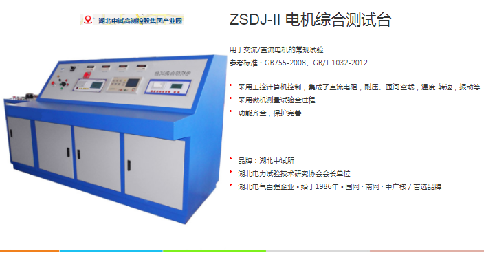 ZSDJ-II 电机综合测试台电机综合测试台是成套装置,系统采用工控计算机控制,集成了直流电阻,耐压、匝间、空载,温度,转速,振动等多项目的测量。具有测试速度快、精度高、使用方便、可靠性好等优点,主要用于交流电机的常规试验或大修、出厂试验。