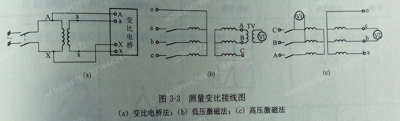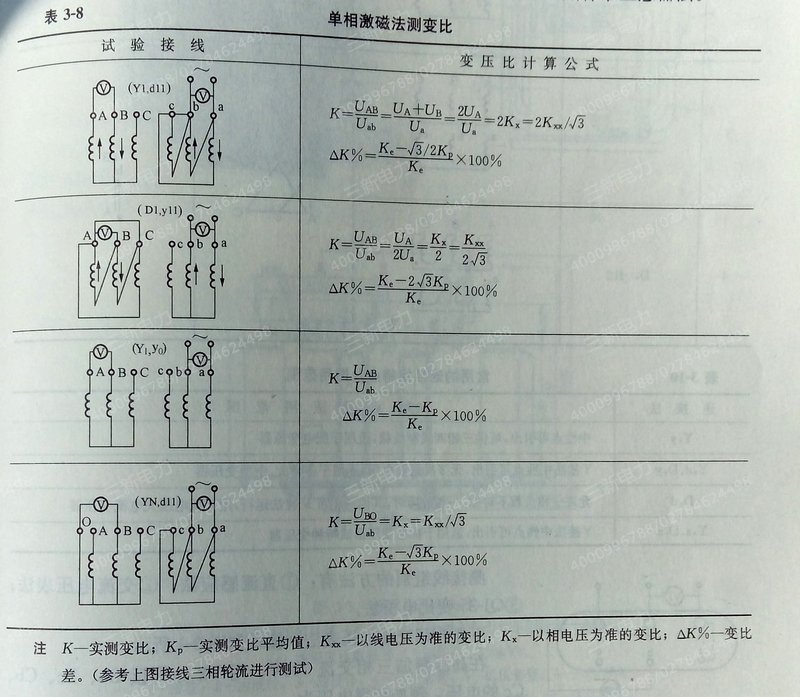 一般可用变比电桥法进行,对三相变压器用单相激磁法进行。为克服铁芯中剩磁影响可采用双电压表法。各相间测得的电压比取平均值即为变比。单相激磁法优点是提高准确度和使故障明显化,其试验接线及计算方式如表3—8所示。有条件时也可用标准互感器法。