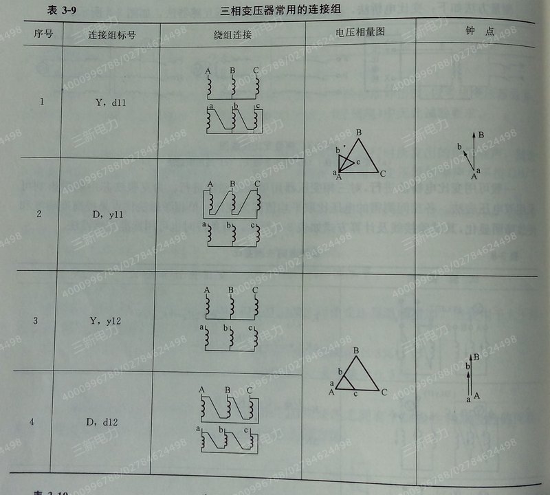 由电机学可知,当三相绕组连接时存在着一、二次电压的相量关系,有Y,y、D,d、Y,d、D,y、Y,z、D,z点等接法,在表3—9、表3一10中列出了常用的连接组别及适用范围。