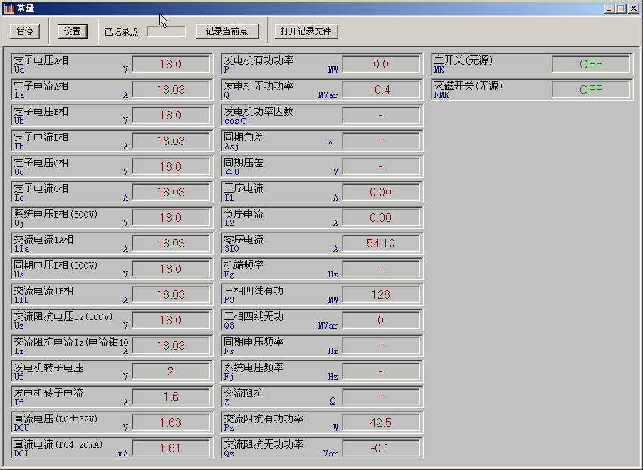 这个窗口中,显示参量的实时有效值及开关状态,每秒刷新一次。显示刷新可以暂停。