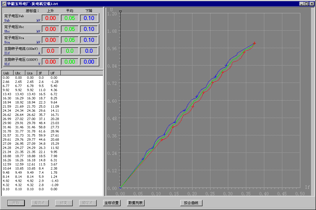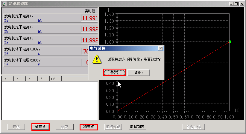 6.2.3 下图为模拟的上升曲线,在做试验过程中如果需要记录稳定点可以点稳定点,在励磁加到最大时需要点最高点,进入下降阶段