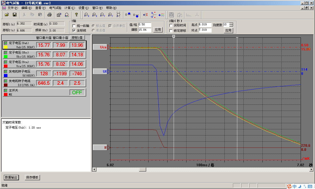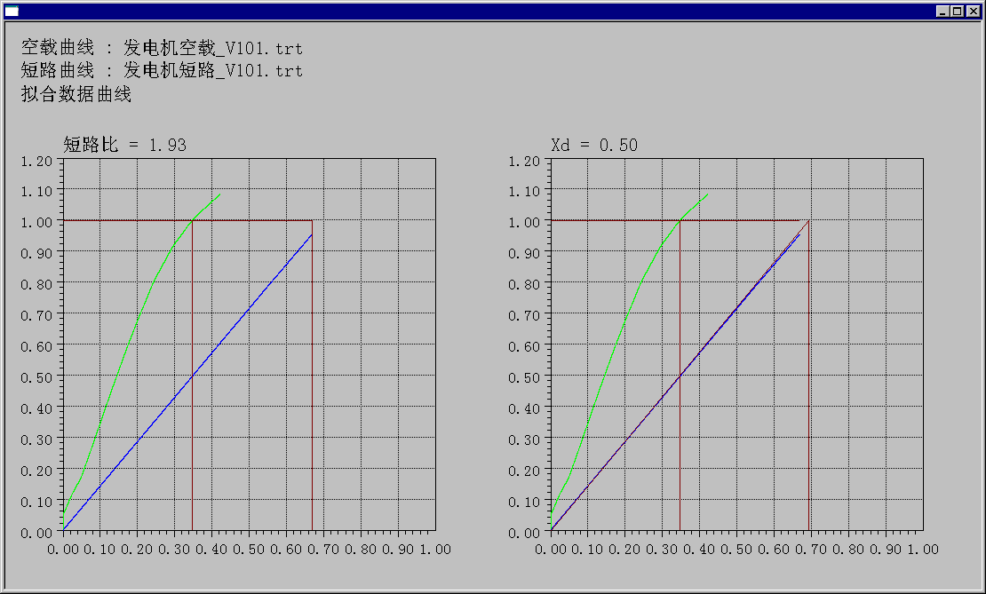 计算窗口给出了机组的短路比、Xd值。此项功能要求发电机空载数据达到机端电压的1.0倍以上。