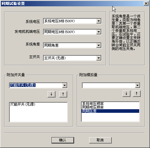 同期试验用于记录并网时刻Uj,Us’的相角差;试验中,通常需要用Us折算Uj’,所以,必须获得正确的主变升压比、转角差。在“电气试验”(Trial.exe)的同期试验模板中,有“主变升压比”、“主变转角补偿”,是必须正确设置的参数;其定义如下: