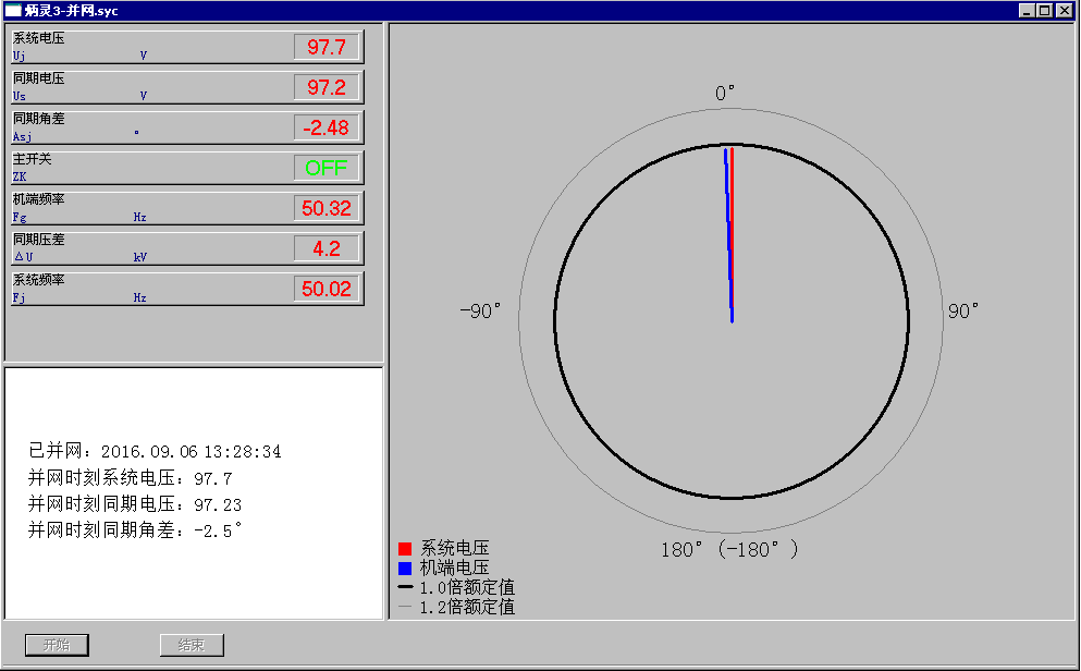 6.4.3 点击开始进行假同期试验,当主开关动作时同期表自动停止,点击结束按钮,保存试验数据