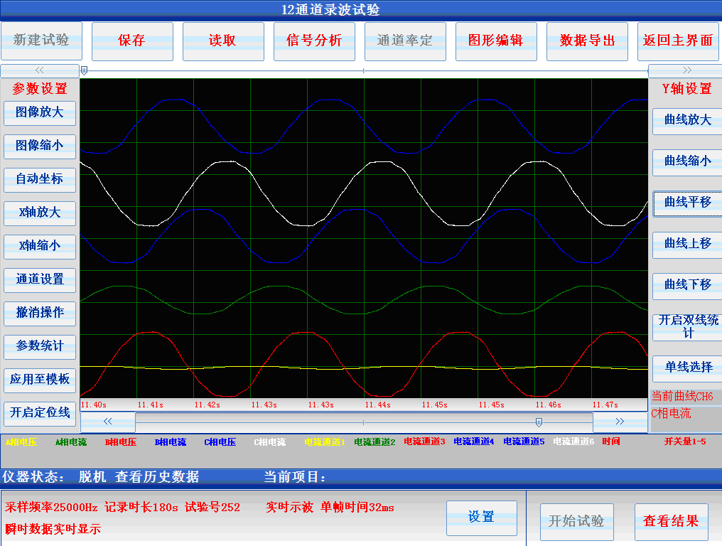 软件工具中的示波器组件负责完成数据采集过程中的波形实时展示,数据分析中的波形放大,缩小,定位,参数统计等,以及整个试验模板的通道展示名称,单位,时间窗口范围,通道坐标范围,是否隐藏通道,当前展示坐标轴等。