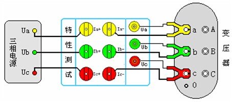 利用仪器的Ua、Ub测量电压,用A相电流回路测量电流,依次对被测变压器的低压侧Ao、Bo、Co加电,进行测试。