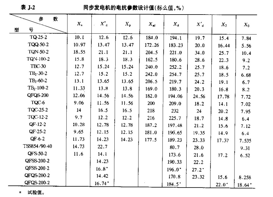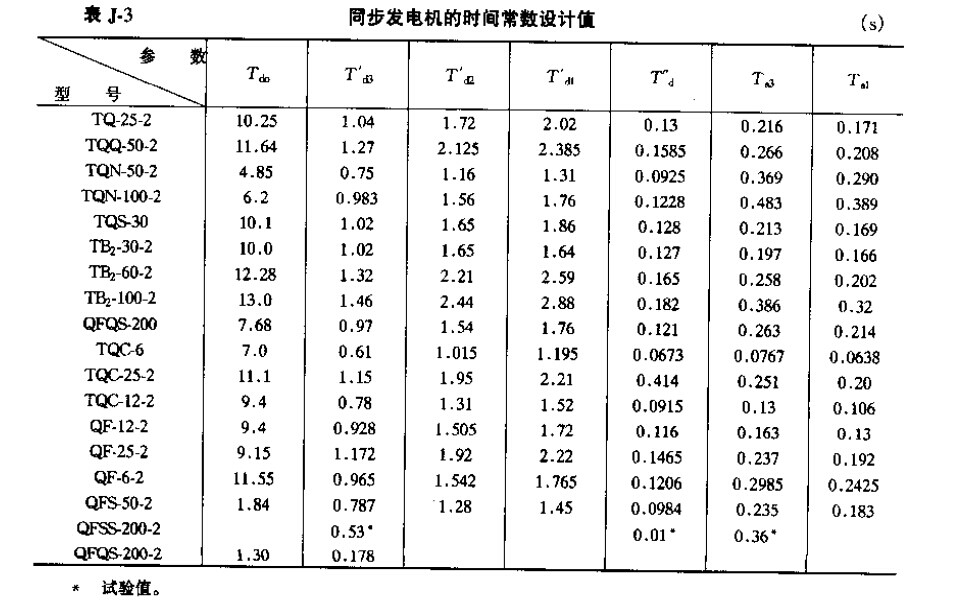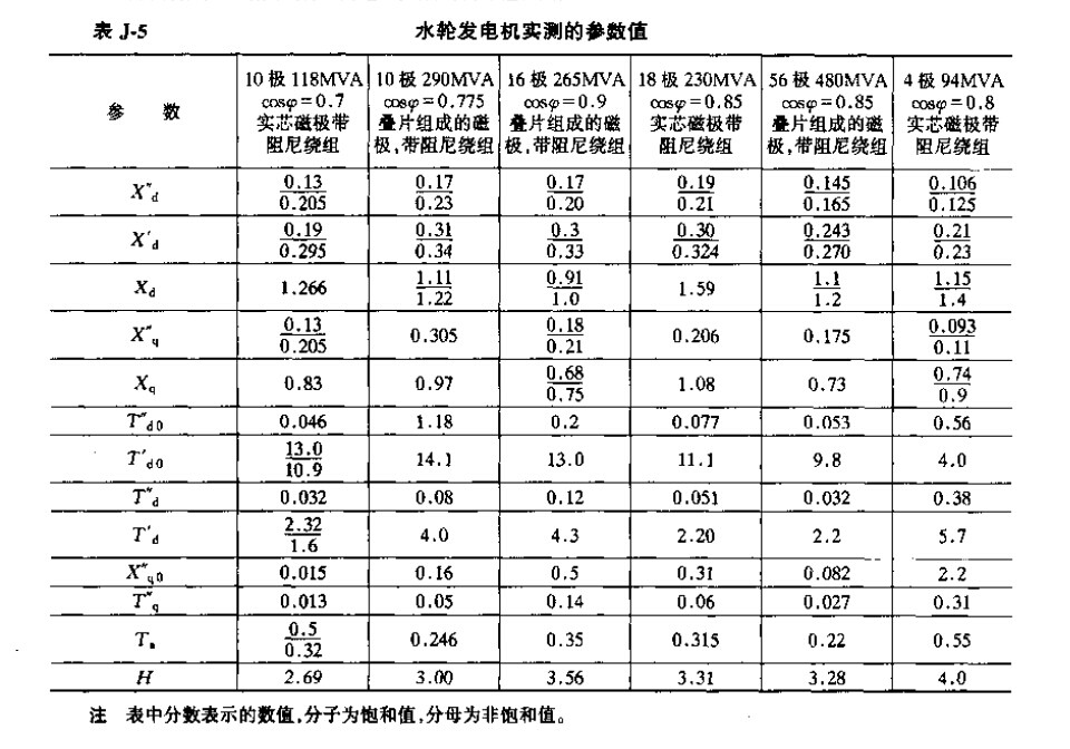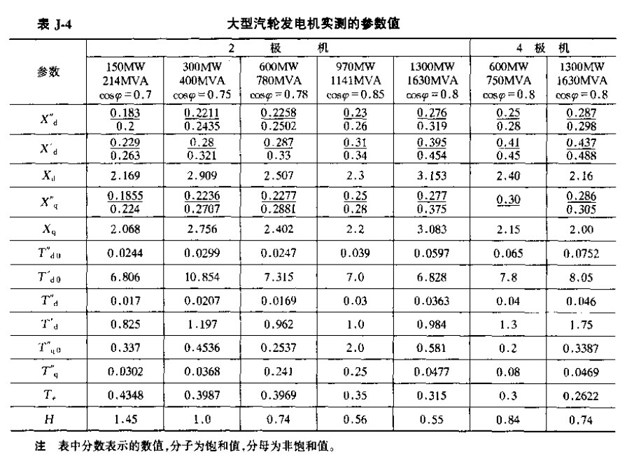同步发电机的参数(参考值)