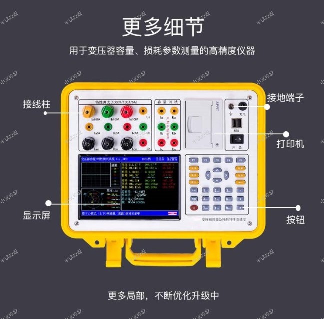 变压器容量空负载损耗测试仪:变压器容量及空载负载测试仪针对这种问题专门开发、研制的专门用于变压器容量、损耗参数测量的高精度仪器。它自带高效能充电电池,不用外接电源即可工作,充电一次可连续测量500台次;