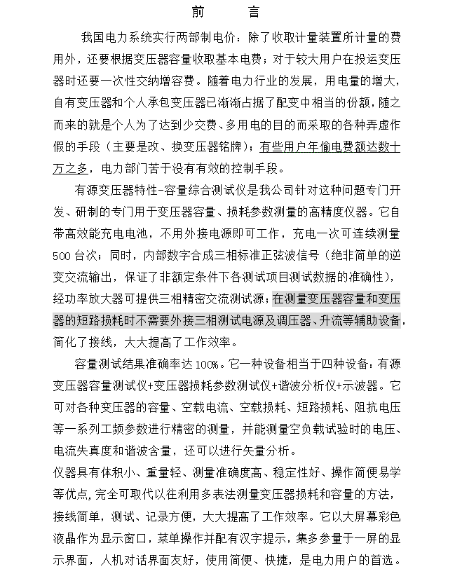 在测量变压器容量和变压器的短路损耗时不需要外接三相测试电源及调压器、升流等辅助设备,简化了接线,大大提高了工作效率。