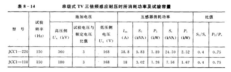 根据串级式TV的具体参数可以算出在三倍频感应耐压时所消耗的功率及试验容量比见表8—14。