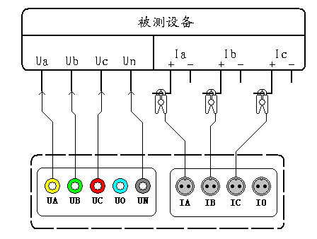 在三相四线制接线方式时用黄色导线联接被测设备的A相电压和仪器的A相电压端子、绿色导线联接被测设备的B相电压和仪器的B相电压端子、红色导线联接被测设备的C相电压和仪器的C相电压端子、黑色导线联接被测设备的零线Un和仪器的N相电压端子;三只钳形电流互感器用来测量被测设备电流的A、B、C三相,接好线后进入“电气参数”屏查看测量结果。