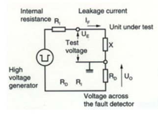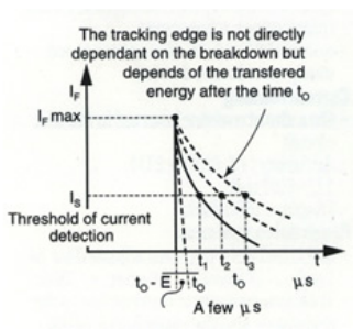 ΔIr= 1 mA变化是当前最常用的表征击穿的值,它必须链接到检测器的响应时间,响应时间对于确定击穿电压非常重要,实际上,过快的检测(少于1微秒)会使设备对击穿之前的局部放电现象敏感。反过来,缓慢的检测(超过几十微秒)会使设备对某些击穿不敏感,这些击穿的能量(产生ΔIf2.Δt)足以破坏性,但持续时间太短而无法考虑由探测器,但是,检测器的响应时间应非常短,以避免某些绝缘体上发生微碳化现象或对其他绝缘体产生确定性破坏。