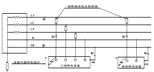 如图1所示,又称四线半系统。其特点是末级供电变压器中性点直接接地,供电线路在进入建筑前由四根线路(L1,L2,L3,PEN)组成,四线的末端(一般是在进入建筑处)将PEN线分为中性线N和保护干线PE(并采用重复接地措施),分开后不再合并。系统利用安装熔断器或断路器与线径的配合实现相线之间、相线与中性线之间短路或过负载保护(过流保护);用电设备的外露可导电部分通过自身的PE线接到PE干线上,当绝缘失效,发生常见的相线与设备外露可导电部分相接触时(接地故障之一),短路电流Id可通过PE线使保护装置动作并使外壳对地电压降低,从而实现保护。
