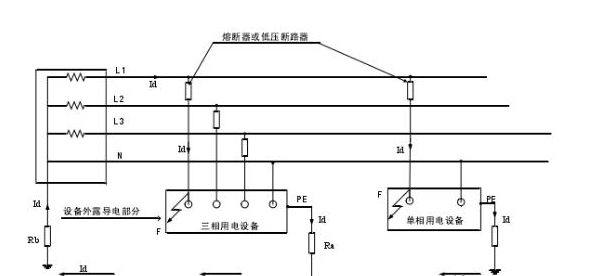 对于TT系统,当外壳出现接地故障时,电气设备容量较大就可能出现短路电流Id小于熔断器熔体的额定电流的情况。此时熔体不熔断,故障长期存在,从而电气设备持续发热,有可能引发电气火灾。所以,在TT系统中,只有各设备的可靠接地及合理选择接地电阻参数,才能使该系统安全运行。