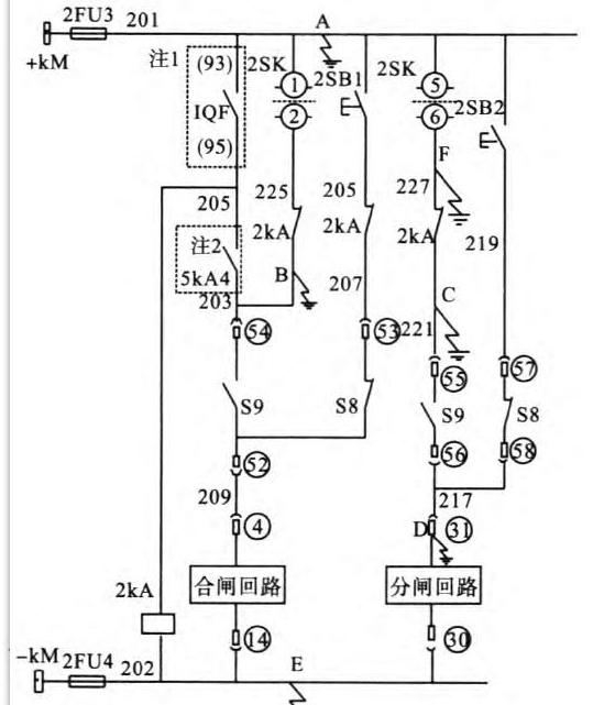 如上图所示,直流接地故障发生在C、E两点,D、E两点,F、E两点接地时,分闸线圈被短接,保护动作及操作时开关拒跳。同理,两点接地开关也可能合不上,如B、E两点接地时。
