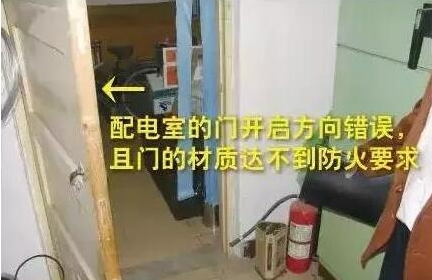 4配电室门开启方向错误,材质不符合要求。隐患危害:当配电室发生较大安全事故时,向内开启的门将为人员的逃生增加阻碍,材质不达标则会在人员逃生过程中增加触电风险。