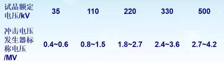 按照试验标准并考虑足够裕度,冲击电压发生器的标称电压与被试设备的额定电压之间的关系满足下表,下限值供形式试验需要,上限值供试验研究用。