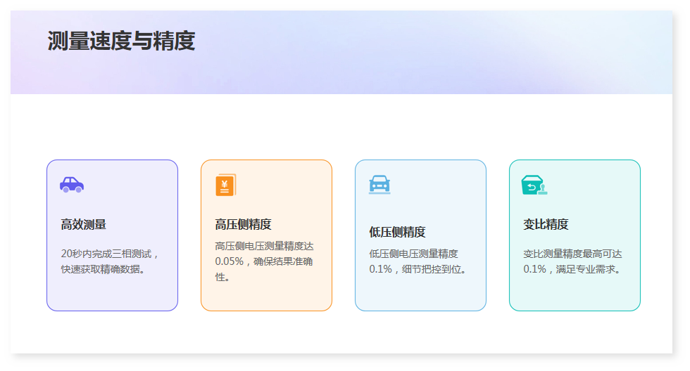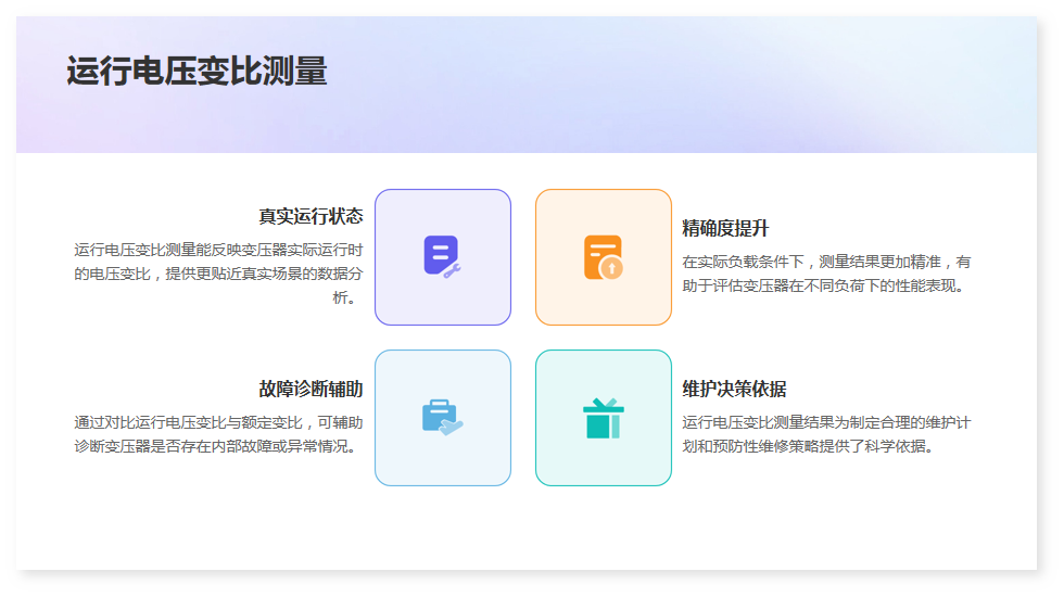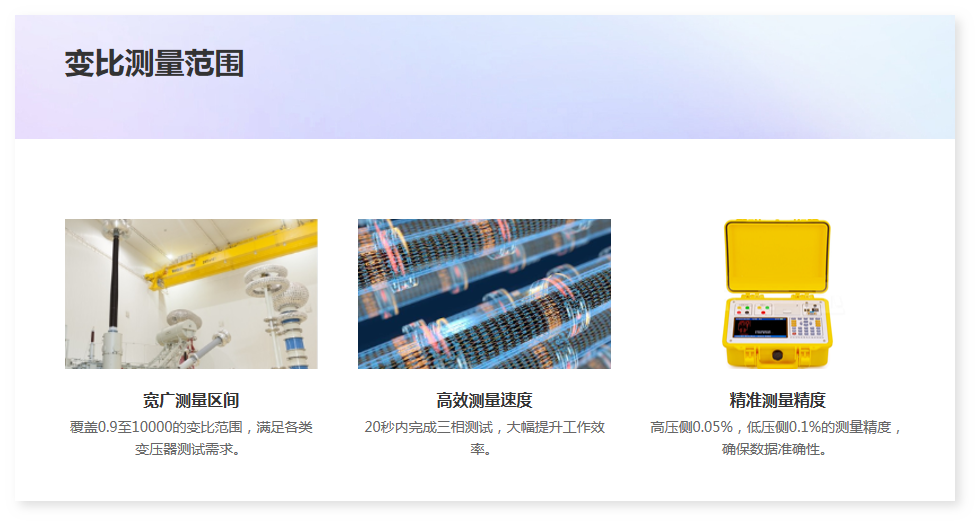 2·根据IEC及国家有关标准规定,在电力变压器生产 、用户交接和检修试验过程中,变压器变比试验是必做的项目。这样可有效监督变压器产品出厂及使用过程中的质量,防止变压器匝间短路,开路,连接错误,调压开关内部故障或接触故障。
