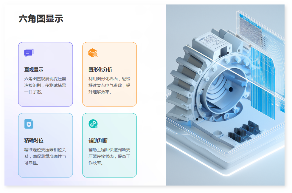 3·六角图显示功能:结果以数字和六角矢量图显示,直观的看出变压器连接组别情况。