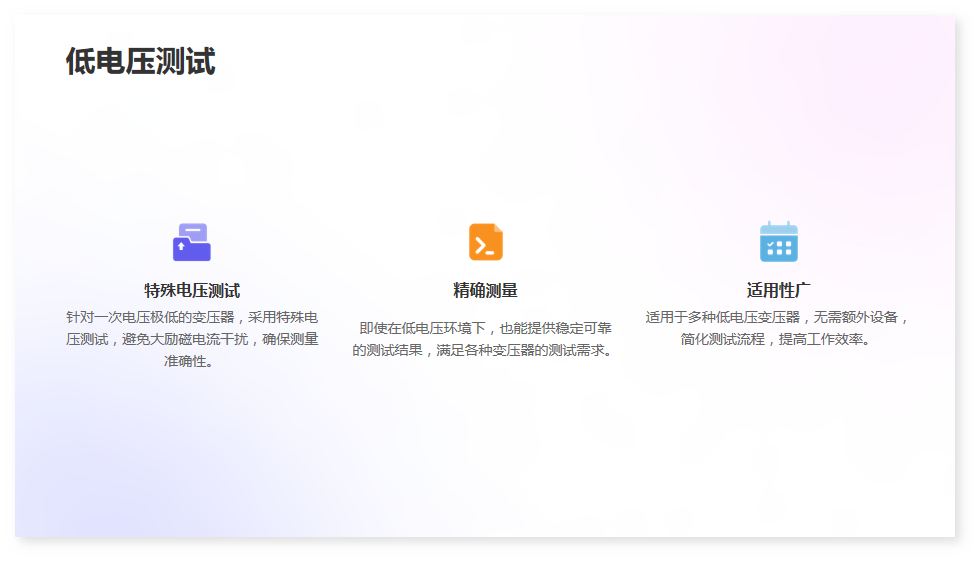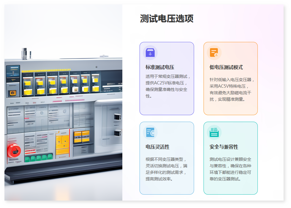 8·具有低输入电压变压器专门测试功能,对于一次电压很低的变压器采用特殊电压进行测试,避免励磁电流太大而无法测试的情况。