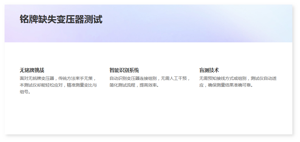 4·盲测功能:无需选择接线方式,无需选择接线组别,测量Y/△、△/Y变压器无需外部短接,可根据选择的测试内容自动切换接线方式。完全可以对没有铭牌的变压器进行变比和组号的测量。