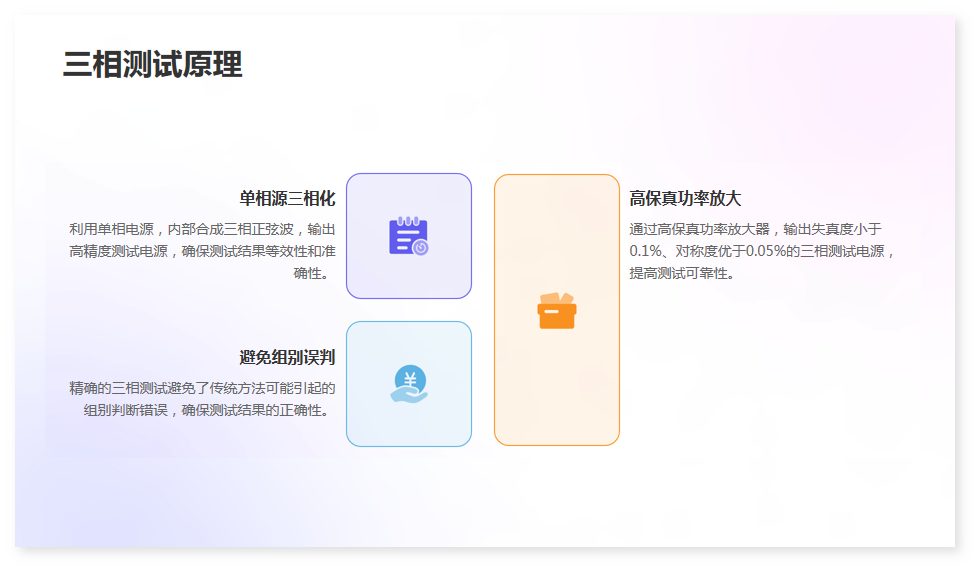 1·真正三相测试:单相电源输入,内部数字合成三相标准正弦波信号源,通过高保真功率放大器,产生三相测试电源(失真度小于0.1%、对称度优于0.05%)输出,测试结果具有更好的等效性,不会出现组别误判等现象。