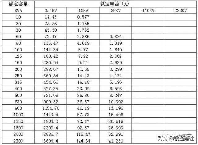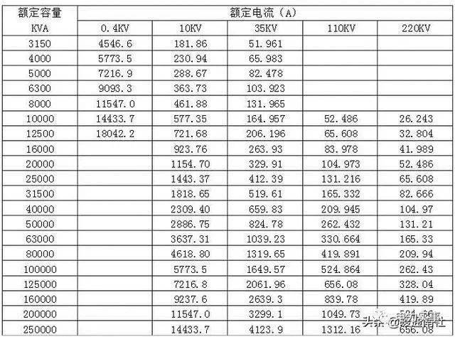 各种容量变压器高低压侧额定电流的数据(包括20、30、50、80、100、160、200、250、315、400KVA等)