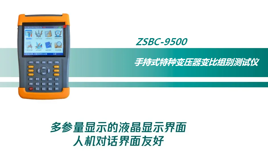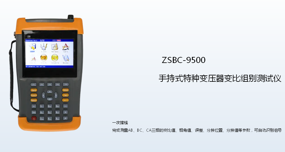 4、我公司自主开发、研制生产的ZSBC-9500 手持式特种变压器变比组别测试仪除具有完全根据用户的现场使用要求,操作简便,功能完备,数据稳定可靠的特点外还是国内到目前为止第一款可以进行盲测(不知道被测变压器的联结方式及组别的情况下准确测量)、测试主变并列运行状态的变压器变比组别测试仪;手持式特种变压器变比组别测试仪从根源上测试变压器并列运行的测试问题,能适应各种大中小型变压器变比测试的需要,是到目前为止国内变比测试中技术先进,测试项目完善,测量参数全面的手持式特种变压器变比组别测试仪。