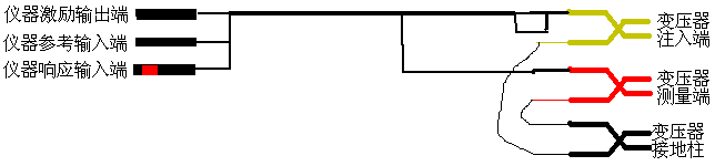 2.将没有红色标记的两根电缆线连接至黄色测试钳,再连接到变压器的信号注入端;