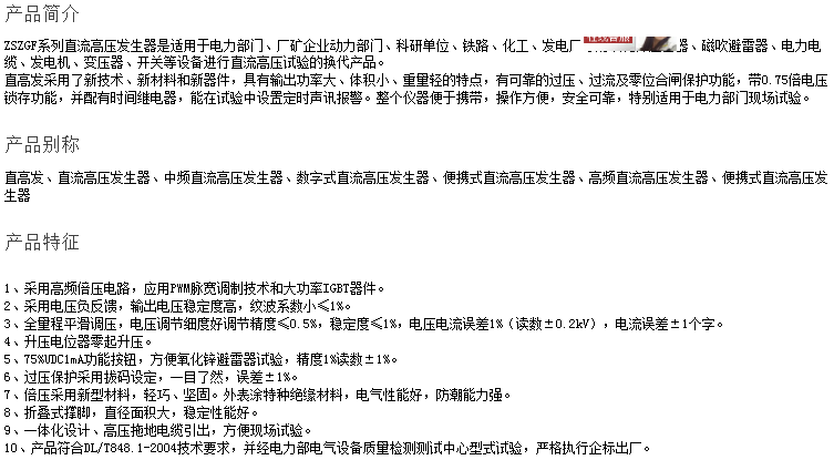 智能直流高压发生器又称高频、一体式直流高压发生器及直流高压发生装置,直流高压发生器输出直流电压等级包括为60kv直流高压发生器、120kv直流高压发生器、200kv及300kv直流高压发生器,直流高压发生器用于电力部门现场试验高压发生专用配套设备,直流高压发生器特别适用于电力部门直流耐压现场试验。