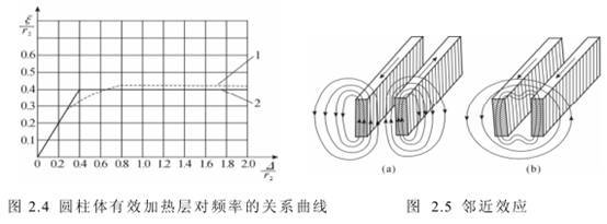 邻近效应原理可解释如下:如果两个平行的导体中流过电流的方向相反时(图 2.5(a)),两导体中电流所建立的磁场在两导体之间的方向相同的,因此两导体中间的总的磁场强度增大,而在两导体外侧的磁场强度减弱。两导体之间的磁感线不仅通过空气,而且也穿过导体内部。显然导体的外侧较内侧要交链更多的磁通,因此导体外侧的阻抗值比内侧大。因此导体外侧较内侧电流密度要小。导体间的距离越近,邻近效应越显著。