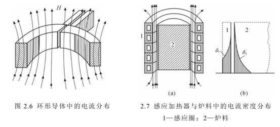 如果在圆环形螺管线圈通过交流电流时,线圈导体的内侧电流密度会比较大(如图 2.6),这种现象叫做圆环效应。导体的径向厚度与圆环直径之比越大,这种效应就越显著。通常磁力线在圆环内集中,在园环外分散,因此导体的外侧较内侧交链较多的磁通,这样导体外侧的电感和阻抗较内侧为大,电流向内侧集聚。感应电炉即是对这几种效应的综合利用。在感应器中置以炉料(见图2.7(a)),在感应器两端施加交流电压,即产生交变磁场。此时感应器本身表现为圆环效应,感应器与炉料间即为邻近效应,而炉料本身表现为集肤效应。感应器和炉料中的电流密度(δ)分布如图 2.7(b)所示。