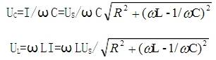 (4)、电感上的电压UL与电容上的电压UC数值相等,相位相差180°,UL=UC=QUS。