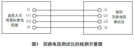 由于回路电阻测试仪是在大电流的条件下工作,为了消除引线电阻、提高测量精度,采用四线制接线测量法,如图3所示。同时为了避免过热,要求电流持续时间要短,使用牢固可靠的电流接线。根据规程的要求均匀的选取检测点进行,其中须包含有显示值的起始点、中间点和接近满刻度点。