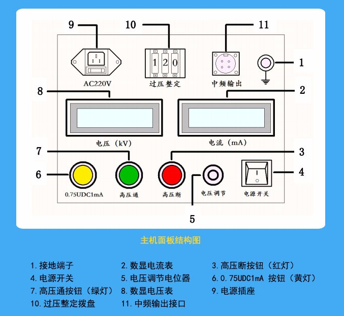 5、本装置使用时,输出的是高电压或超高电压,必须可靠接地,注意操作安全距离。