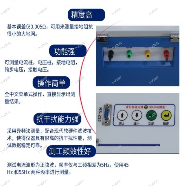 ZSDW-5A大地网接地电阻测试仪适用于测试各类接地装置的工频接地阻抗、接触电压、跨步电压、等工频特性参数以及土壤电阻率。本仪器采用异频抗干扰技术,能在强干扰环境下准确测得工频50Hz下的数据。测试电流大5A,不会引起测试时接地装置的电位过高,同时它还具有极强的抗干扰能力,故可以在不停电的情况下进行测量。
