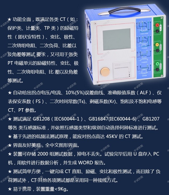 4、基于先进的低频法测试原理,能应对拐点高达45KV的CT测试。