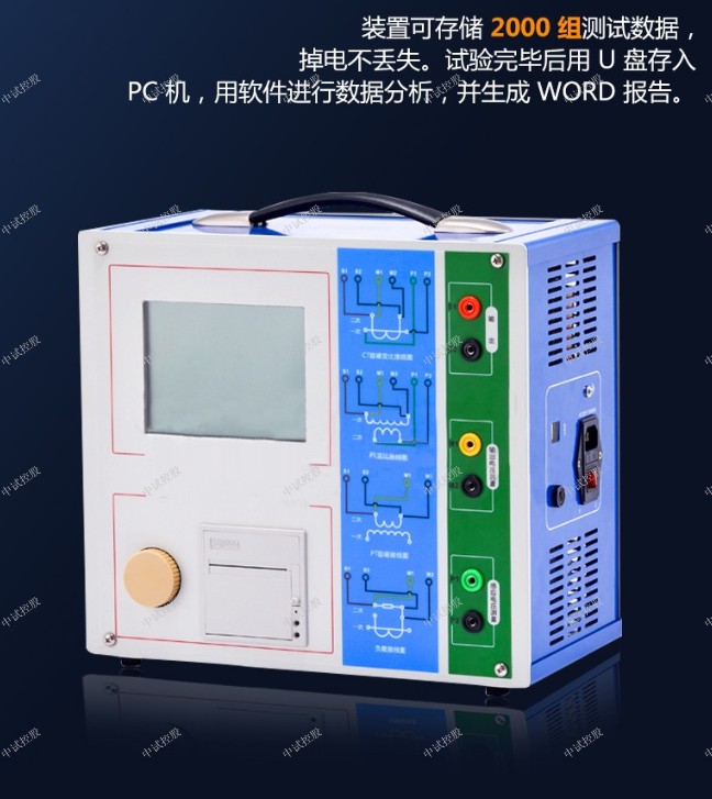 6、装置可存储2000组测试数据,掉电不丢失。试验完毕后用U盘存入PC机,用软件进行数据分析,并生成WORD报告。