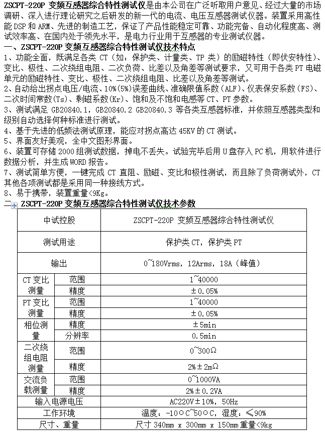 ZSCTP-220P变频互感器综合特性测试仪(精度0.05%)是由本中试控股在广泛听取用户意见、经过大量的市场调研、深入进行理论研究之后研发的新一代的电流、电压互感器测试仪器。装置采用高性能DSP和ARM、先进的制造工艺。用于保护类电流互感器(CT)及电压互感器(PT)多种参数的高精度测量。满足各类CT(如:保护类、计量类、TP类)的励磁特性(即伏安特性)、变比、极性、二次绕组电阻、二次负荷、比差以及角差等测试要求,满足各类PT电磁单元的励磁特性、变比、极性、二次绕组电阻、比差以及角差等测试。可实现一键完成CT直阻、励磁、变比和极性测试功能,自动化程度高、稳定可靠,在国内处于领先水平。