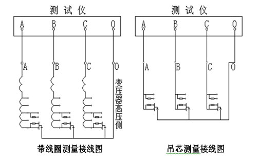 将仪器内附的4根(红、绿、黄、黑)大线夹取出来,用大线夹夹住变压器高压端子的A、B、C和中性点O端,将线的另一接线端子分别插入仪器面板上的A、B、C、O插孔。用小夹子将变压器低压侧的a、b、c、O端子短路接地即可。