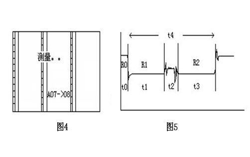启动变压器有载开关测试仪,当听到有载开关动作对触头进行切换的声音时阻值随之发生变化。仪器将自动搜索到过渡波形,并显示在屏幕上。用四组光标移动键调整光标位置到波形串联.并联.串联的明显转折处。按“相序选择”键选择调整A.B.C三项,光标调节好后显示屏上将直接显示出波形时间和电阻值。各段参数的意义如图5所示,R1和R2是过渡电阻值, T0是三相同期,T2是桥接时间,T4是过渡时间。处理好三项的参数后,就可按“打印”键进行打印。这时打印的图纸包括波形和处理的参数值。