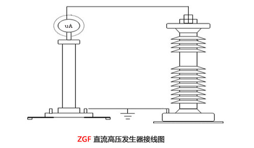 直流高压发生器使用前,按照下图所示,接好连接线和地线,并确保接地可靠,如果氧化锌避雷器拆卸之后测量,应当将氧化锌避雷器置于绝缘体上,并保持足够的安全距离。