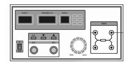 调节面板上的“电流调节”旋钮,至所需测试电流值。此时时间窗口显示剩余测试时间。如被测物合格,测试时间一到,仪器会发出“嘟”一声后,且“合格”指示灯亮,电阻显示窗口示值即为被测物的接地电阻值;当测量电阻值大于报警设定值时,“报警”指示灯亮,待测试时间一到,仪器停止工作,并发出声报警,则判被测物为不合格品。然后按一下“复位”键,仪器退出测量状态,回到初始状态,“测量”指示灯灭。