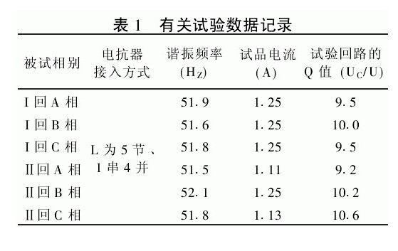 云南电力试验研究所对昆明供电局柳东I、II回110kV交联电力电缆进行交流耐压试验,采用的是调频方法及串-并联谐振接线方式(见图3所示);其两条电缆长度均为2·1km,每km的电容量为0·12μF,每一相电缆总电容量大约为0·27uF,采用的补偿电抗器为4个并联,每个电抗器的电感量为200H左右,串联电抗器电感也为200H左右,在电抗器1串4并的串并联谐振接线情况下,通过变频电源尽量使试验频率接近于50Hz,计算的试验频率大约为48·45Hz,计算被试品电力电缆的电容电流大约为9·04A,4个电抗器补偿电感电流为7·23A,每个补偿电抗器通过的电流不到2A,而串联回路中的电抗器电流仅为1·81A,这样每个电抗器只需要耐压150kV电流大于2A;升压变压器的变比为K=18 000V/400V=45,输出电压为18kV,电流也只需要2A就能满足试验要求,试验数据见下表。
