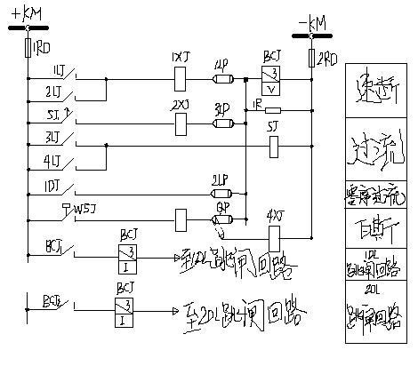 器SJ带电,触点SJ1经过一定延时后闭合,将回路+KM→延时闭合的触点SJ1→信号继电器2XJ→连接片3LP→出口继电器BCJ→-KM回路接通。最后,由出口继电器BCJ的触点BCJ1和BCJ2去动作跳闸回路。