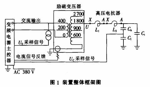 耐压试验装置结构和原理 智能型高压变频串联谐振试验装置是一种用小容量低电压的电源获得高电压大容量的输出成套试 验装置.该装置主要由变频电源主控器、励磁变压器、 电抗器和电容分压器组成。试验装置整体结构如图1所示.变频电源主控器输出幅值为0~400 V、频率为30~300 Hz的连续可 调交流电压信号。该信号经过励磁变压器升压后 传输给由电抗器和测试品电容串联组成的LC谐振 回路。因为高压试验需要的电压等级较高,为了安全及操作方便.采用先调频后调压的策略,即先用智能矫正器(实现装置频率f的闭环控制和频率步长大小调节)智能寻找进入谐振状态的频率fn,使回路达到谐振状态.