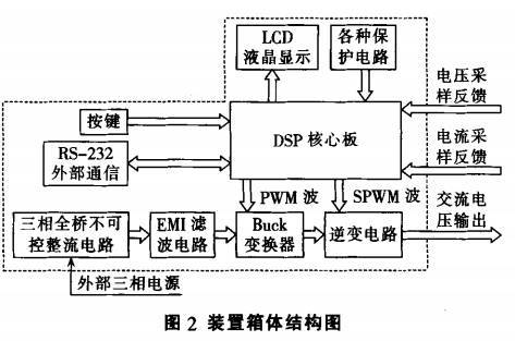 DSP产生频率可调的SPWM波和占空比可调的PWM波后,经I/O口分别输送给逆变电路和功率调节电路。 外部存储器模块由DSP控制.主要用于存储试验的重要设置以及试验数据.使装置重启动之后无需重新 设置;输入模块直接与DSP相连,用户可以通过直接对DsP输入命令来调节正弦波的频率:显示模块主要显示试验电压、频率等数据.并通过人机界面进行实验数据的相关设置。