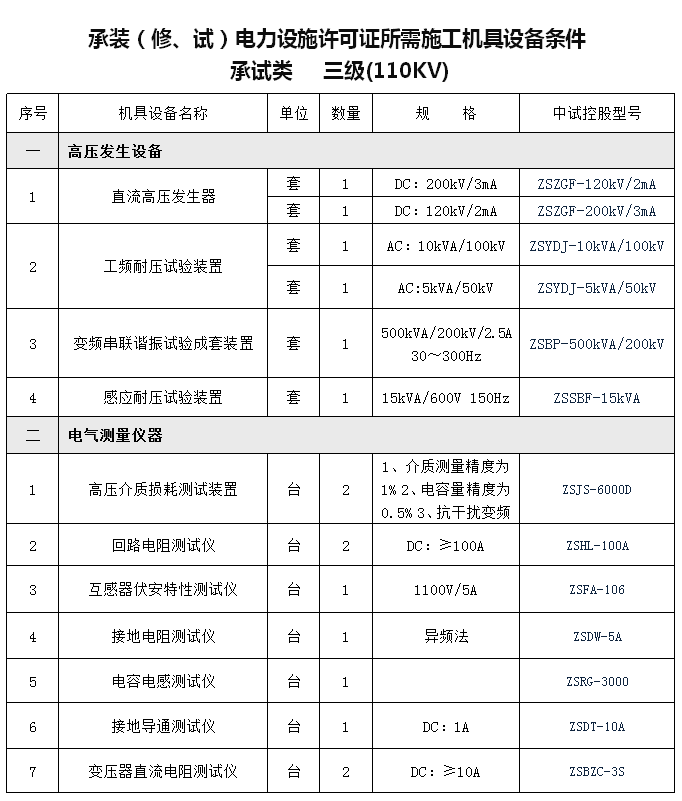 三级:全国统一新规定,从2017年12月1日起执行,国家能源局对电力承试类资质设备进行了调整,各省区的承试类资质设备是一致的。取得三级许可证的,可以从事110千伏以下电压等级电力设施的安装、维修或者试验活动。